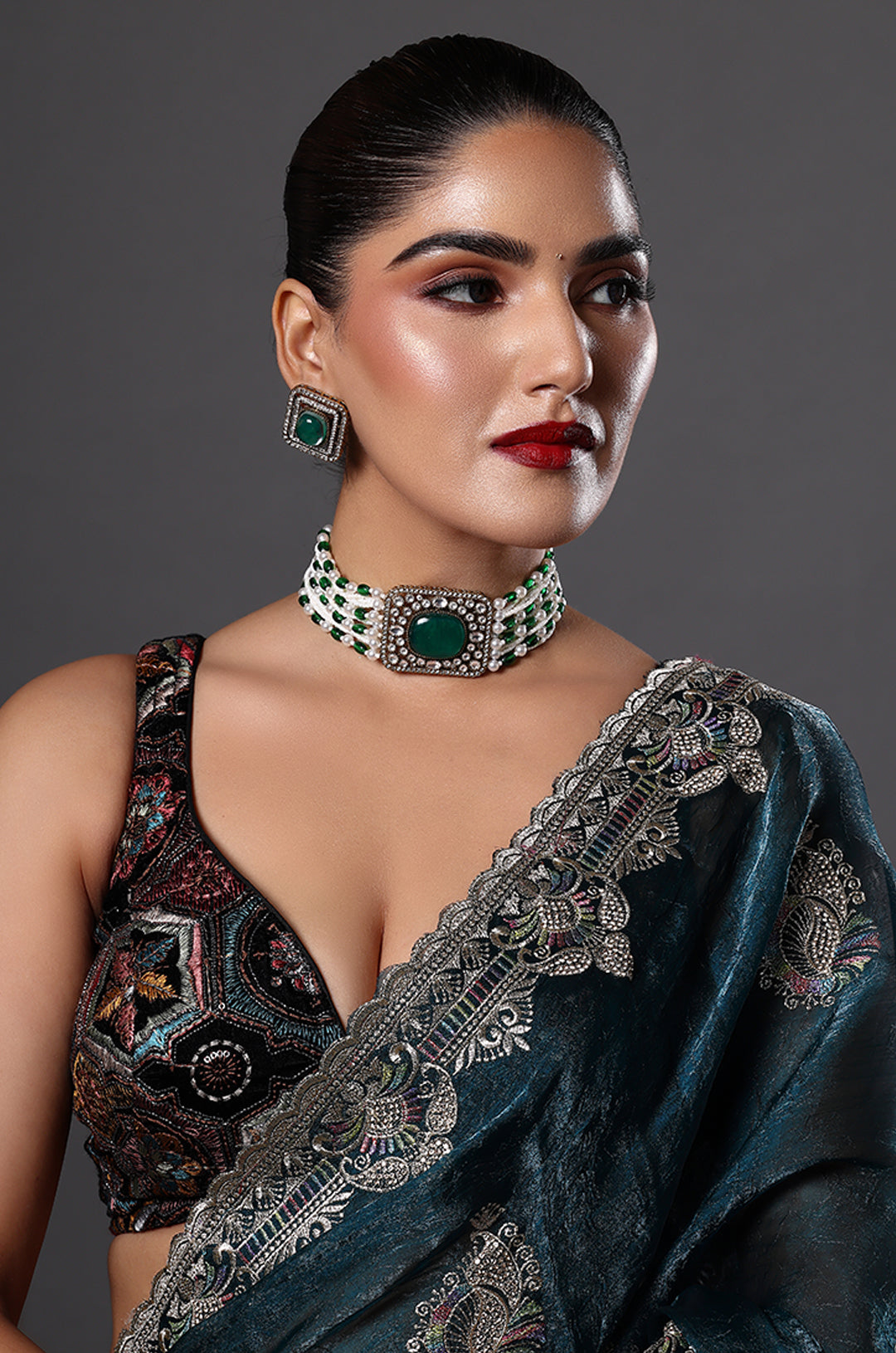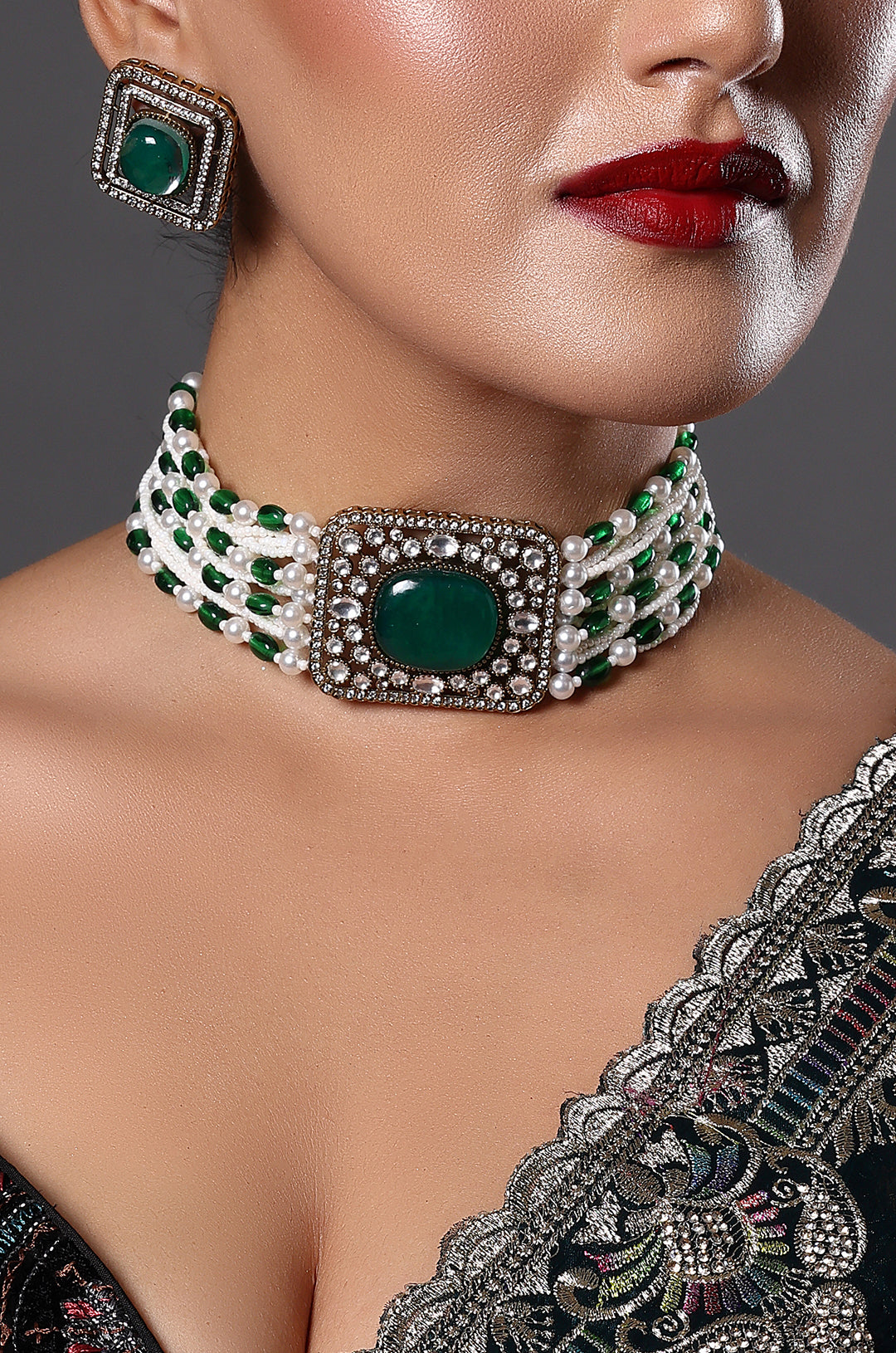 A classic pearl choker accented with green stones and vintage detailing, perfect for enhancing traditional attire.