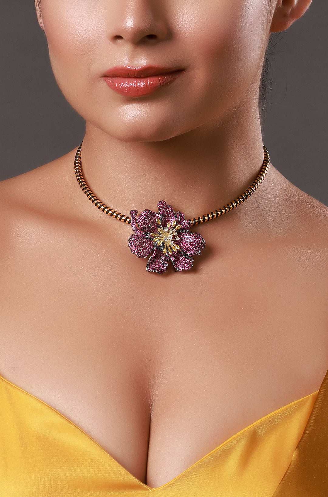 A unique choker necklace featuring a floral pendant with rich purple gemstones, possibly amethysts or a type of spinel, set in a textured, gold-toned metal.