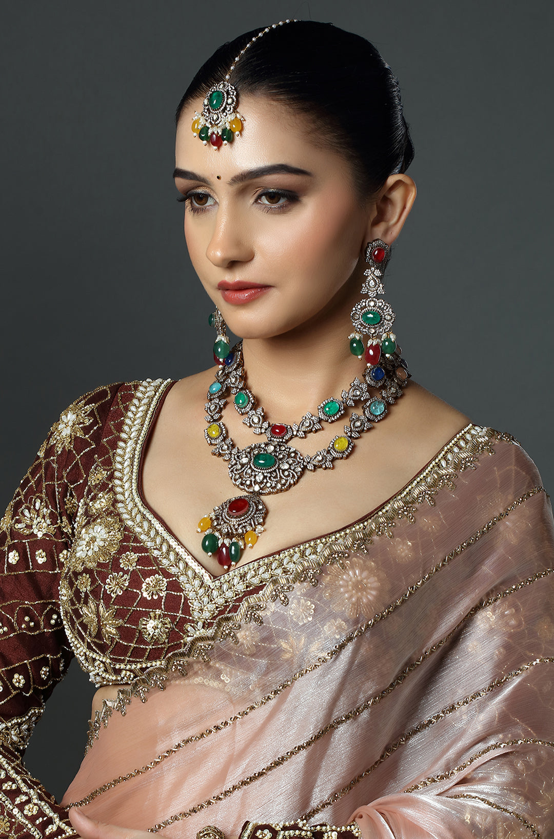 A richly designed layered necklace with deep green stones, creating a bold and graceful look ideal for festive wear and special occasions